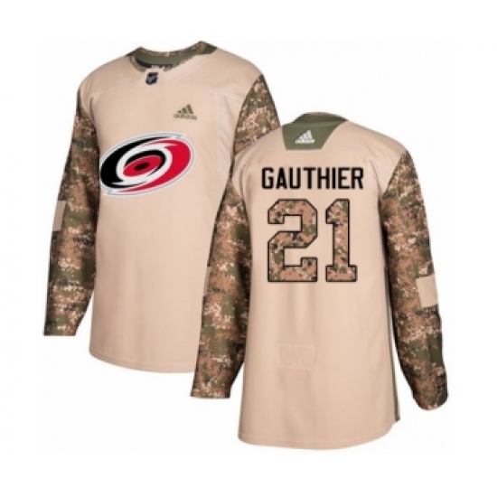 >Men's Adidas Carolina Hurricanes #21 Julien Gauthier Authentic Camo Veterans Day Practice NHL Jersey
