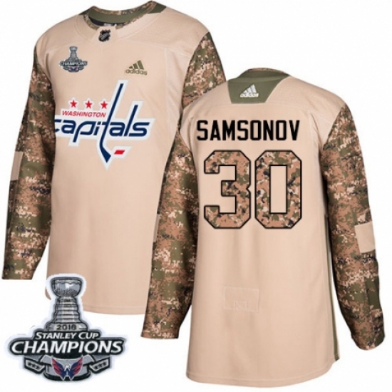 >Men's Adidas Washington Capitals #30 Ilya Samsonov Authentic Camo Veterans Day Practice 2018 Stanley Cup Final Champions NHL Jersey