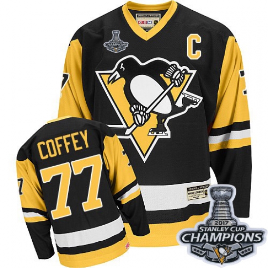 Men's CCM Pittsburgh Penguins #77 Paul Coffey Authentic Black Throwback 2017 Stanley Cup Champions NHL Jersey