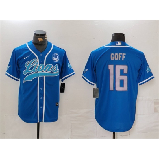 Men's Detroit Lions #16 Jared Goff Blue With 90th Anniversary Cool Base Stitched Baseball Jersey