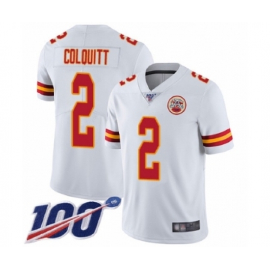 >Men's Kansas City Chiefs #2 Dustin Colquitt White Vapor Untouchable Limited Player 100th Season Football Jersey