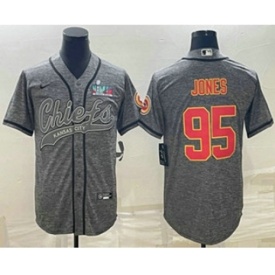Men's Kansas City Chiefs #95 Chris Jones Grey With Super Bowl LVII Patch Cool Base Stitched Baseball Jersey