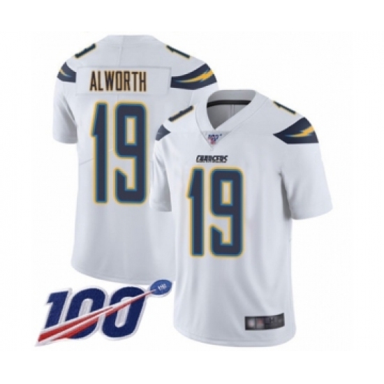 >Men's Los Angeles Chargers #19 Lance Alworth White Vapor Untouchable Limited Player 100th Season Football Jersey