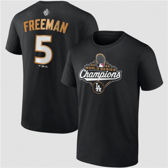 >Men's Los Angeles Dodgers #5 Freddie Freeman Black 2025 World Series Champions Name & Number T-Shirt