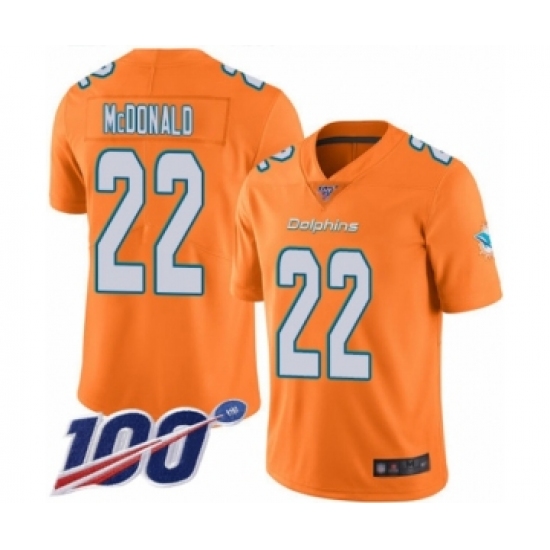 >Men's Miami Dolphins #22 T.J. McDonald Limited Orange Rush Vapor Untouchable 100th Season Football Jersey