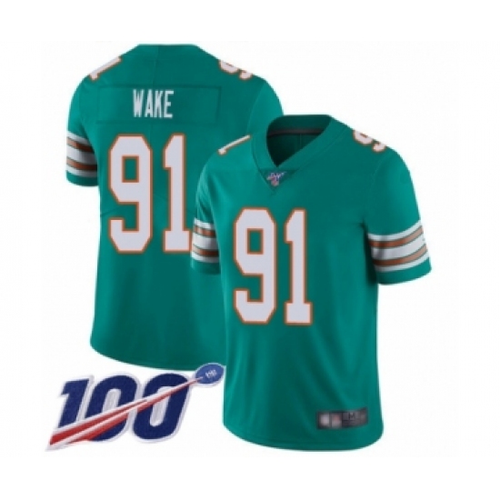 Men's Miami Dolphins #91 Cameron Wake Aqua Green Alternate Vapor Untouchable Limited Player 100th Season Football Jersey