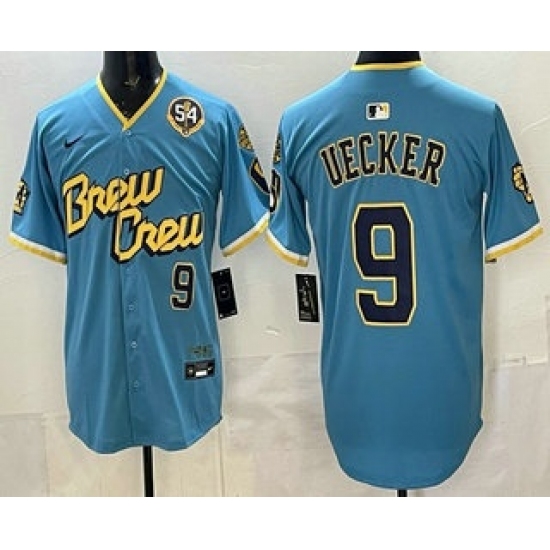 Men's Milwaukee Brewers #9 Bob Uecker Powder Blue City Connect With Cool Base Stitched Jersey