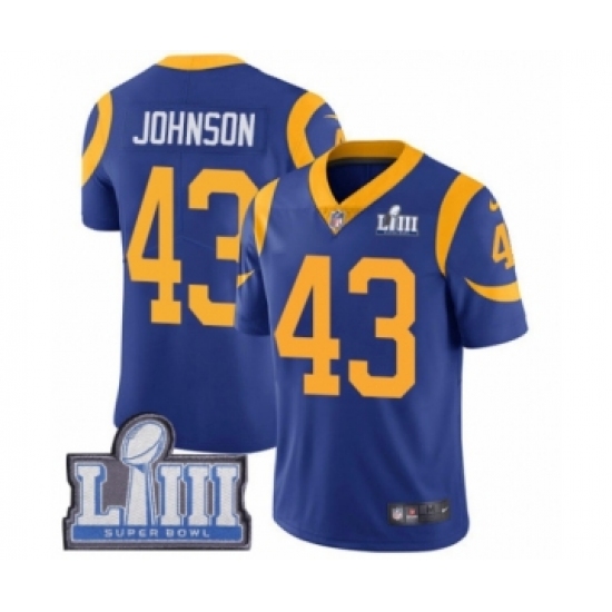 >Men's Nike Los Angeles Rams #43 John Johnson Royal Blue Alternate Vapor Untouchable Limited Player Super Bowl LIII Bound NFL Jersey