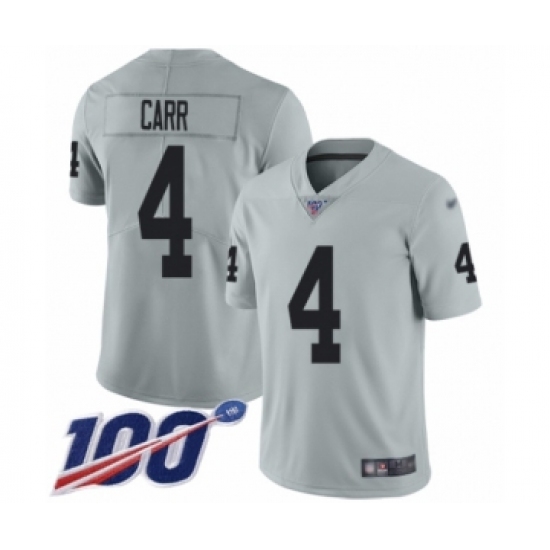 >Men's Oakland Raiders #4 Derek Carr Limited Silver Inverted Legend 100th Season Football Jersey