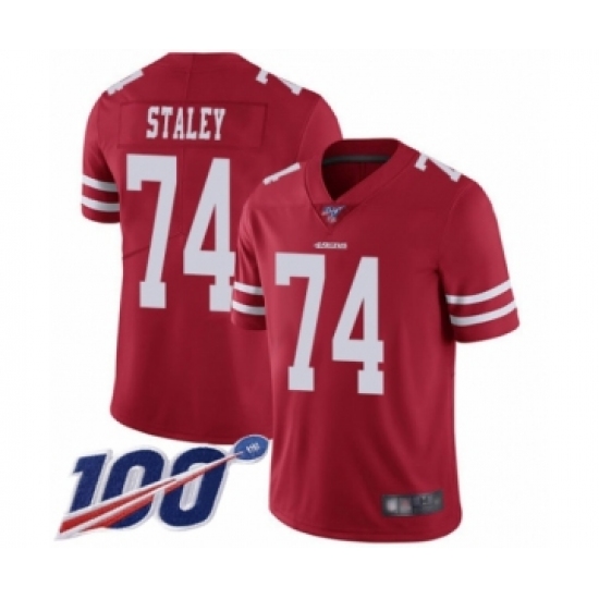 Men's San Francisco 49ers #74 Joe Staley Red Team Color Vapor Untouchable Limited Player 100th Season Football Jersey