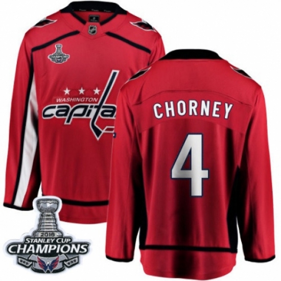 >Men's Washington Capitals #4 Taylor Chorney Fanatics Branded Red Home Breakaway 2018 Stanley Cup Final Champions NHL Jersey
