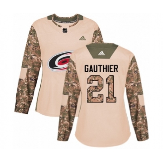 >Women's Adidas Carolina Hurricanes #21 Julien Gauthier Authentic Camo Veterans Day Practice NHL Jersey