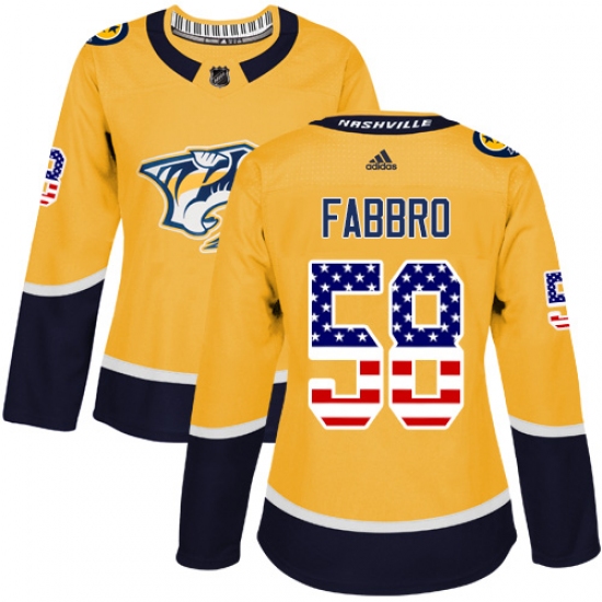 Home>NHL>Nashville Predators>Dante Fabbro>Women's Adidas Nashville Predators #58 Dante Fabbro Authentic Gold USA Flag Fashion NHL Jersey