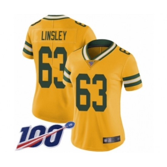 >Women's Green Bay Packers #63 Corey Linsley Limited Gold Rush Vapor Untouchable 100th Season Football Jersey