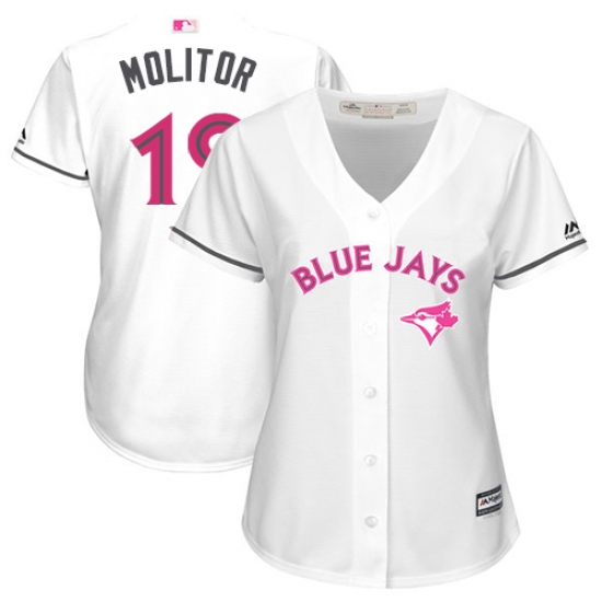 Home>MLB>Toronto Blue Jays>Paul Molitor>Women's Majestic Toronto Blue Jays #19 Paul Molitor Authentic White Mother's Day Cool Base MLB Jersey