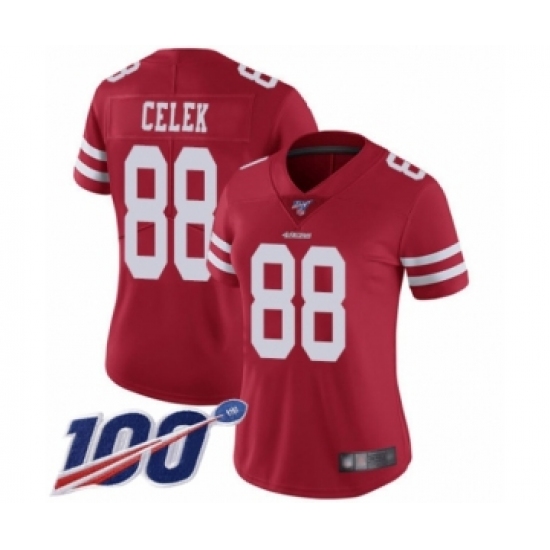 >Women's San Francisco 49ers #88 Garrett Celek Red Team Color Vapor Untouchable Limited Player 100th Season Football Jersey