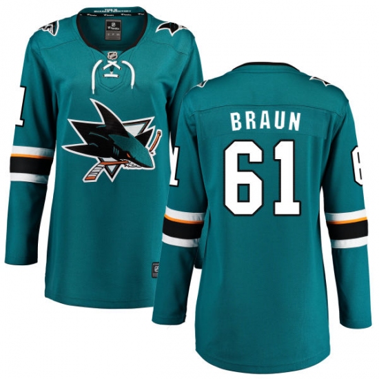 Home>NHL>San Jose Sharks>Justin Braun>Women's San Jose Sharks #61 Justin Braun Fanatics Branded Teal Green Home Breakaway NHL Jersey