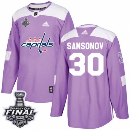 >Youth Adidas Washington Capitals #30 Ilya Samsonov Authentic Purple Fights Cancer Practice 2018 Stanley Cup Final NHL Jersey