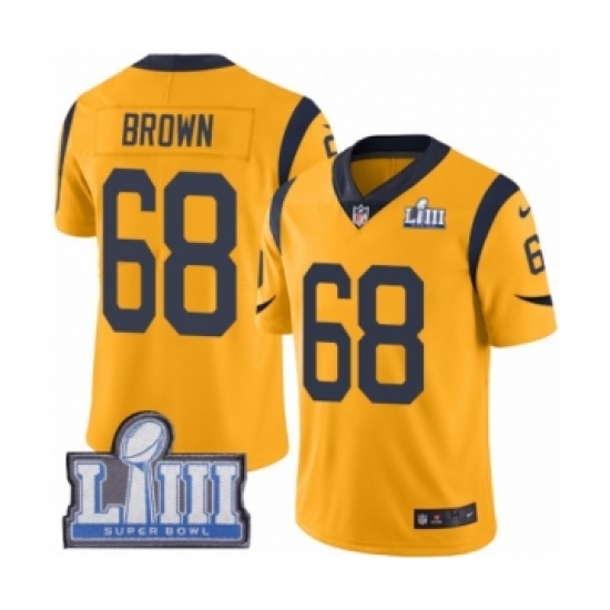 >Youth Nike Los Angeles Rams #68 Jamon Brown Limited Gold Rush Vapor Untouchable Super Bowl LIII Bound NFL Jersey